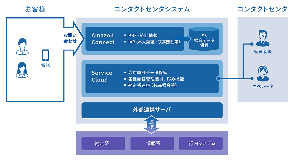 - アマゾン ウェブ サービスのAmazon ConnectとSalesforce Service Cloudを連携させオンプレミスのコンタクトセンターシステムをすべてクラウド上に再構築。地方銀行で初の両サービスを組み合わせたフルクラウド型のコンタクトセンターシステムを実現
