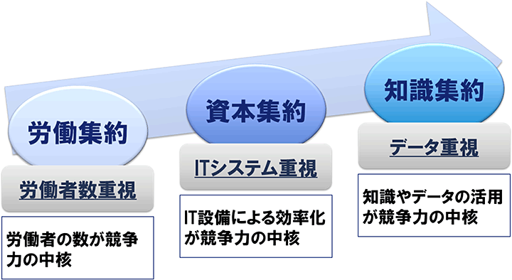 産業革命以来、工業化、商業化、サービス化、情報化の進展により、社会は大きく発展してきました。その間、企業は様々な技術革新を通じて、製品・サービスを創り出し、市場を開拓・拡大して、社会の発展に大きく寄与してきました。製品が市場の中心だった従来は、いいモノを作れば売れる時代とも言え、大量生産によりいいモノをより安く市場に提供することが企業競争力の中心だったと言えます。つまり、労働者を数多く集め、機械化や分業化、多角化によって企業を成長させていく労働集約型のビジネスが全盛でした。その後、製品産業からサービス産業へと時代は進み、情報処理技術、インターネット技術、モバイル技術等が浸透し始め、IT化による効率化やサービスの高度化が競争力の中核をなす時代となります。技術の進化はベンチャー企業を育み、優れた個人のアイディアがビジネスの様相を一変させ、ユーザの欲するニーズや経験、価値を捉えた技術、サービスは、市場に出てユーザに利用されながら大きなビジネスに成長していくことが可能な時代となりました。企業がユーザの活動や発信情報を分析できる現在、この種のデータをどう活用するかがビジネスの成否を決めると言ってもいいでしょう。今後は、ライフログ、ワークログ、センシング情報による環境データ等々、様々なデータや知識、ノウハウを活用することが競争力の源泉となる「知識集約の時代」になると考えられます。