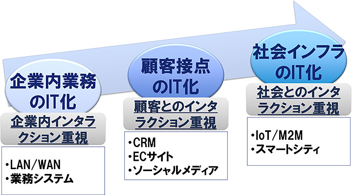 情報処理技術、ネットワーク技術、センサ技術の普及により、IT化の流れが加速しています。従来は企業内業務のIT化による業務の効率化や高度化が中心でした。現在はインターネットを通じた顧客接点のIT化によるビジネス拡大やサービスレベルの向上が実現されています。今後は、IoT(Internet of Things:モノのインターネット)やM2M(Machine to Machine)技術の進展により、社会インフラのIT化が進み、「環境変化の捕捉」による全体最適が可能になると考えられます。環境変化の捕捉は、医療・防災・交通・行政・エネルギー等、街や生活を構成する様々な社会インフラを生活者のニーズや環境の変化に合わせて適切かつリアルタイムに制御し、様々な社会課題にも自律的に対応できる世界を実現します。