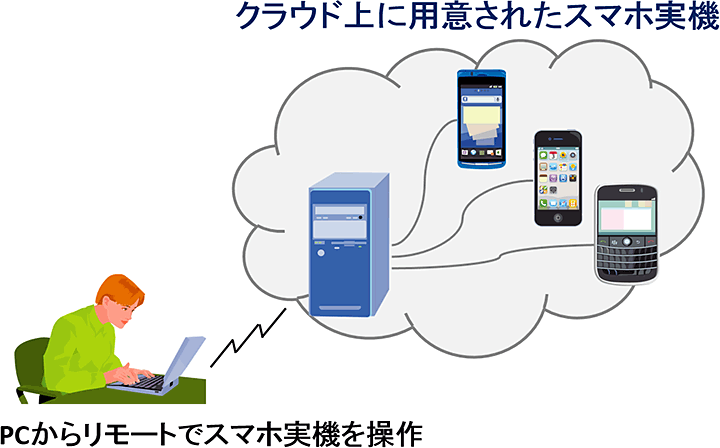 こうした問題に対する1つの解決策が、スマホの実機検証のためのクラウドサービスです。サービス提供会社が所有するスマホの実機をクラウドに接続しておき、クラウドにアクセスした利用者がPC上から実機を操作できる、というものです。日本ではSonix社のScirocco Cloud参考1やNTTレゾナント社のDevelopers AppKitBox参考2といったサービスがあります。NTTデータでは、これらのサービスをスマートフォン関連部門横断組織「スマートフォンラボ」が検証・評価しています。こうしたサービスを利用すれば、対応している機種は自ら実機を購入しなくてもテストができます。低価格のメニューもありますので、個人でスマホのアプリを作っている方も手軽に利用することができるでしょう。