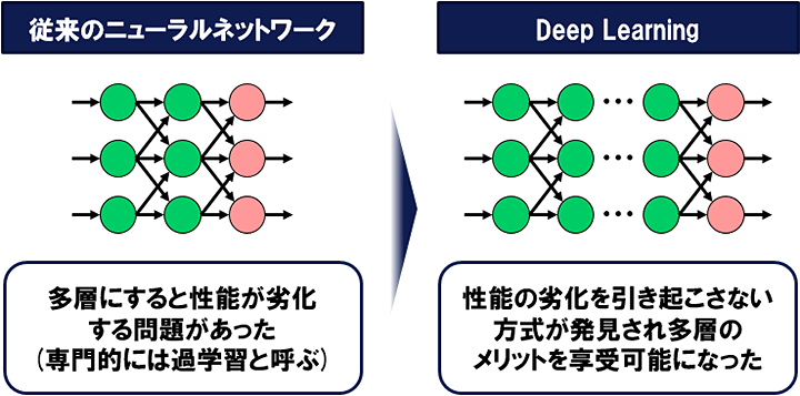 Deep Learningはニューラルネットワークと呼ばれる人間の脳を模倣した仕組みを採用しています。ニューラルネットワークは昔から存在する技術ですが、人間の脳に近い多層型では正常に動作しない問題がありました。しかし、ここ10年間の研究でさまざまな課題が克服され、多層型で従来手法を超える性能を確保できるようになりました。