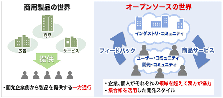 これまでOSS(オープンソースソフトウエア)は商用製品の対抗軸として成長してきましたが、最近では商用ベンダーが、OSSの持つ俊敏性や先進性を取り込む動きが活発化しています参考1。なぜOSSはこのような力を持つ事ができるのでしょうか?それは、各企業がOSSコミュニティに貢献しつつ、互いの強みをうまく集結させた共創関係(エコシステム)を構築する事で、集合知を活用した開発が行われているからです。例えば大規模データ処理基盤のOSS「Hadoop」や、IaaSをプライベートで構築できるOSS「OpenStack」においては、業界の枠を超えた数百もの企業が手を組み、ユーザー企業も含む合意形成が図られた上で、数カ月ごとにバージョンアップを繰り返しています。特に「OpenStack」は、最新技術を取り込み、豊富な開発リソースを利用する事でAWS、VMwareに続く第3のプラットフォームとして進化しています参考2。