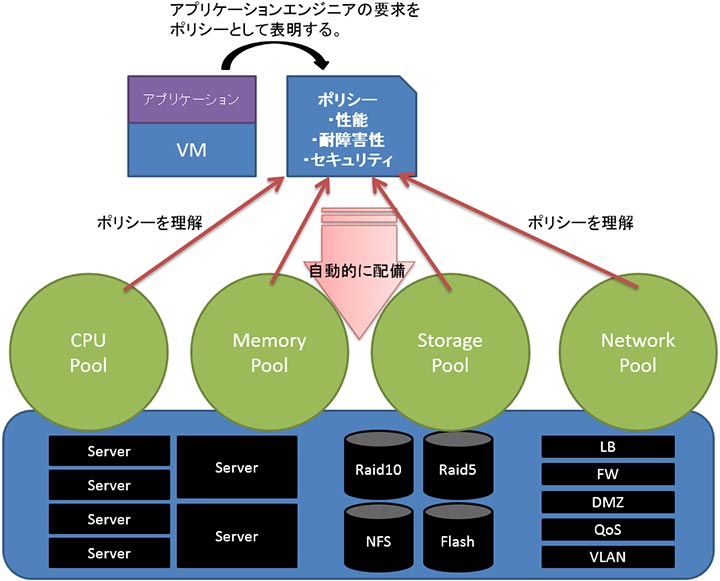 例えば、VMware社の比較的新しいストレージ仮想化技術であるVVOL参考1やVSAN参考2のような技術は、ストレージの機能と仮想マシン(アプリケーション)の要求を紐づけて自動的に適正な配備や移行を行うことを可能とします。同じく、ネットワークの仮想化を行うNSX参考3という技術は、ネットワークの機能と仮想マシンの要求を柔軟に紐づけることができます。このように、仮想化の目指す先には、ポリシーベースのマネジメントがあると考えています。今後、ポリシーベースのマネジメントを具体的に実装した製品やサービスが続々と登場してくるでしょう。