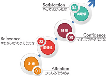 動機づけといえば、インストラクショナルデザインの手法の中にも受講者の動機づけを高めるための「ARCSモデル」がある。これは、米国の教育工学者であるJohn M. Kellerにより提唱されたもので、学習意欲を高める手立てを4つの側面により定義している。4つの側面には、「Attention(注意:面白そうだ)」「Relevance(関連性:やりがいがありそうだ)」「Confidence(自信:やればできそうだ)」「Satisfaction(満足:やってよかった)」があり、これらを満たすことで、魅力的な内容として受講者の学習意欲を高めることができる。