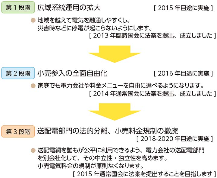 電力システム改革(2013年4月閣議決定)では、安定したエネルギー供給と、電気料金の低減を目的として、一般電気事業者が各地域で担っている発電・送配電・小売のうち、発電と小売を競争環境下におくことで多様な発電形態の実現や電力小売の新規参入を促しつつ、公共性の高い送配電ネットワークを社会インフラとして開放していく。広域系統運用の拡大(2014年)を皮切りに、小売参入の全面自由化(2016年目途)、送配電中立化・料金規制の撤廃(2018~20年目途)という工程が示されており、必要な措置を定めた電気事業法改正案が、国会で順次成立しつつある(図)。