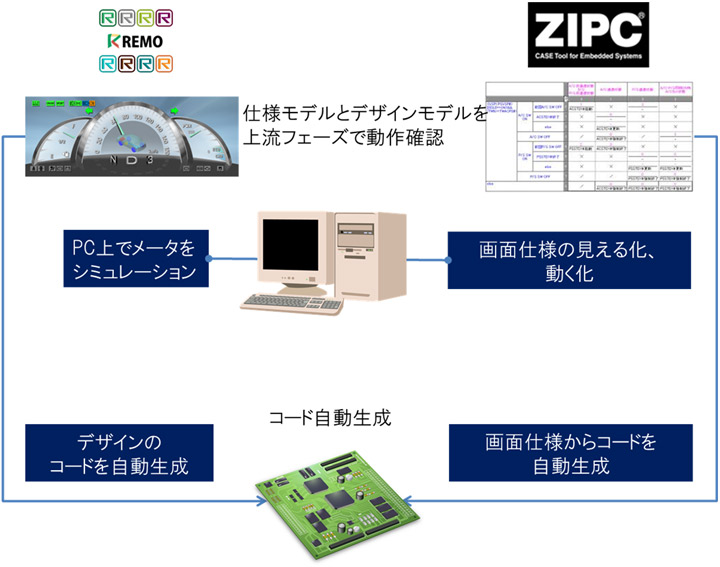 図6の状態遷移表モデルは、警告AとBが発生した場合、警告Bを優先的に表示するように調停しています。HMIはヒトの感性に訴求するものなので、HMIデザインモデルとHMI仕様モデルを動かしてみては洗練化をすすめるといったイテレーション型開発が適しています。そこで、デザインモデルをPC上でシミュレーションし、ターゲットのGPU(Graphics Processing Unit)上で動作するコードを自動生成する3D社のREMO参考4と状態遷移表モデルをPC上でシミュレーションし、ターゲットのCPU上で動作するコードを自動生成するZIPC参考5を連携したRAD(Rapid Application Development)ツールを開発しました(図7)。
