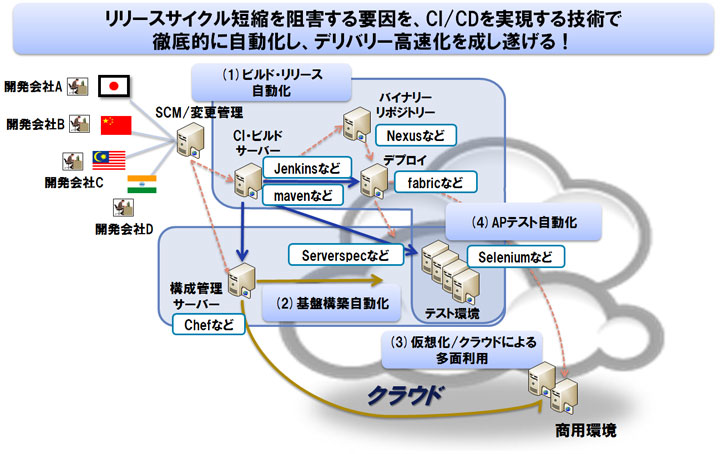 これらの分野において、リリースサイクル短縮を阻害する要因をCI/CDのプラクティスにより徹底的に自動化することで、リリースサイクルの高速化を実現することができます。