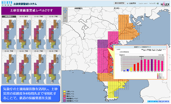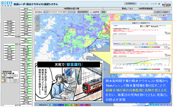 この『HalexDream!』はAPIでの提供を基本としていて、さまざまな業務システムに組み込んで利用することが可能となっています。この特徴を利用して、天気のみならず降雨の状況(予報を含む)や土砂災害リスク等の自動監視機能を実現し、これまで鉄道会社様の運行管理システムや地方自治体の防災システム等でご活用いただいています。最近では農業分野や太陽光発電や風力発電といったエネルギー分野、建設分野での活用事例も増えてきています。