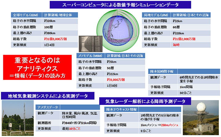 その結果は5kmメッシュ(四角く区切った予報単位のこと)や20kmメッシュといった細かな単位で情報提供していただいているのですが、そのデータは1億個を超える膨大なメッシュの気温や風向風速、気圧といったさまざまなデータが、毎時送られてくるような(頻繁に更新されるような)"ビッグデータ"です。数値予報データだけで送られてくる電文数は約5万電文。1日のデータ量は約50Gバイトに及ぶと言われています(新聞朝刊36ページ換算で約150年分)。さらに最新の気象衛星『ひまわり8号』の画像に至っては1日1テラバイトに及ぶと言われています。