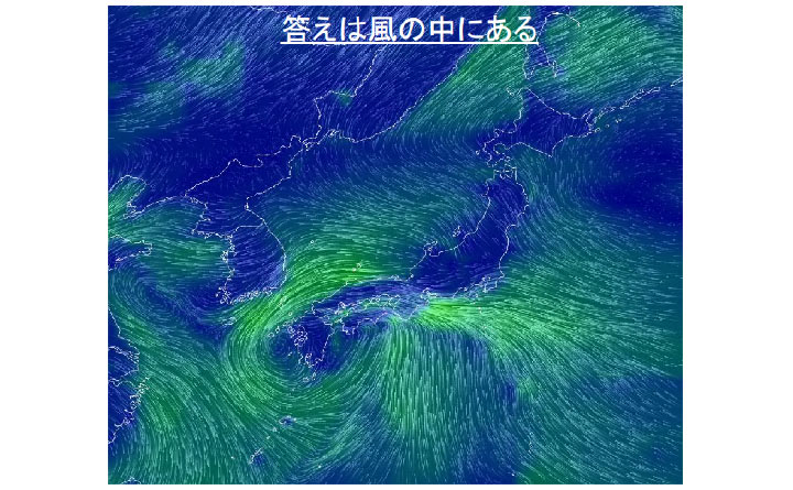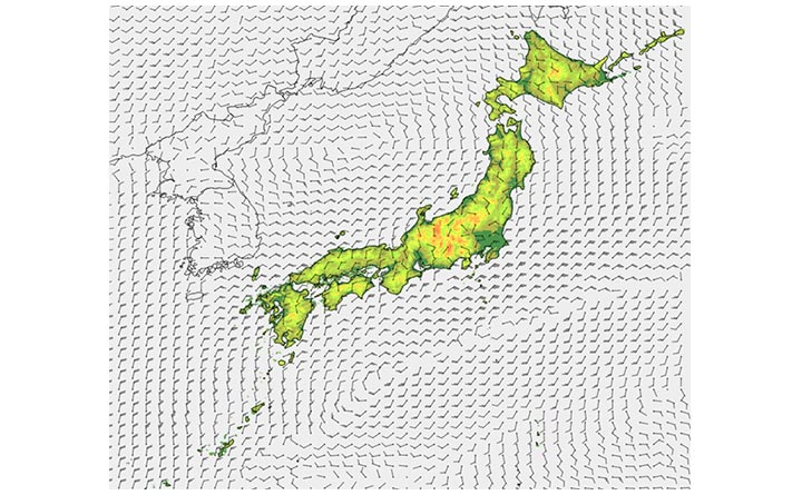 例えば、これまでの天気図で一般的に用いられている風の表現方法は図5に示すような矢羽根です。矢羽根の方向が風の吹いてくる方角を表し、矢羽根に付いたヒゲの本数や太さが風の強さを表していました。これはこれで素晴らしい方法ではあったのですが、それは紙という媒体と、静止画像という表現方法の"制約"の中において優れた表現方法であったと言うことができます。『Weatherview2』では、これをITの力によって、よりグラフィカルに面的な"流れ"として表現することを可能にしました(図5、図6参照。実際は動きのあるアニメーション表示)。