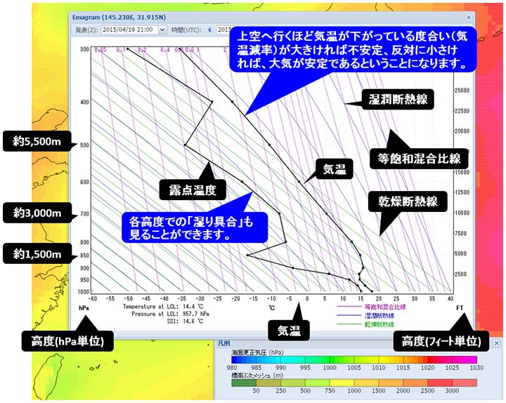 その地点その地点の上空における大気の安定度を評価するために用いられるグラフです。