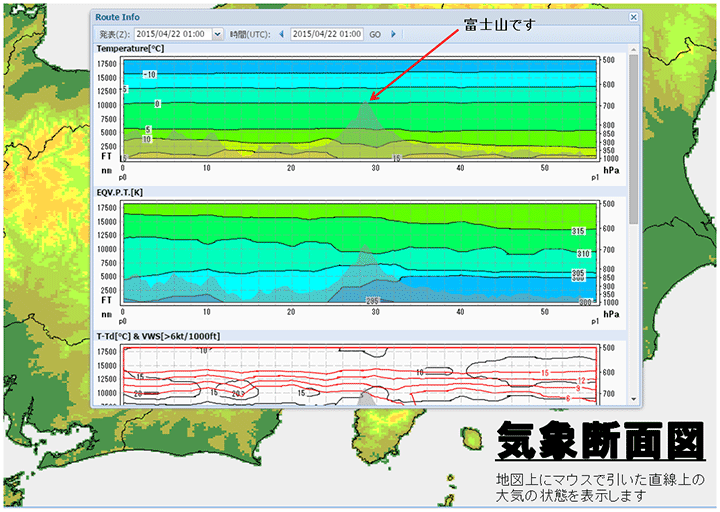 気象は上空の大気の状態(安定度)で決まるので、垂直面を加えた三次元の空間で捉える必要があります。これに挑戦した第一歩がこの「気象断面図」です。
