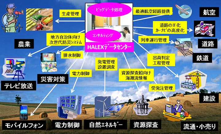株式会社ハレックスはNTTグループ唯一の気象情報会社としてICTを前面に押し出して、同業他社と差異化を図った特徴ある事業展開を行っています。その最大の武器が、自社開発のオンラインリアルタイム・ビッグデータ処理と分散型クラウドコンピューティング処理を用いたシステムが生み出すハレックス社独自の1日48回更新(30分ごと)1kmメッシュの情報鮮度が高い詳細な気象情報提供の仕組み『HalexDream!』です。