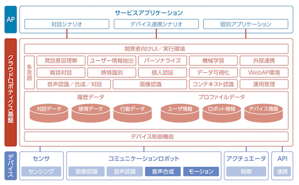 これは、利用者や環境の状況を正しく認識し、複数のロボットやデバイスを統合して高度な知的処理を行うクラウド基盤です。ロボットもデバイスもそれぞれ単体では処理能力に限界があるため、高度な機能をクラウドに集約することによって、付加価値の高いサービスを創出します。