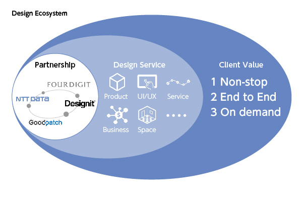 そうした目的の下、NTTデータでは、グローバルデザイン戦略ファームのDesignitをはじめ、UI(User Interface:ユーザーインターフェイス)/UX(User Experience:顧客体験)デザインに特化したFOURDIGIT、GoodPatchとビジネス提携を結びデザインエコシステムを形成しています。