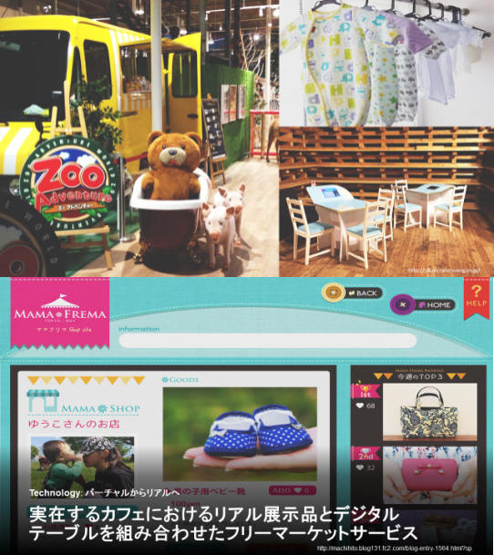 そのカフェは、子育て中のママたちのコミュニティを活性化するための場としてデザインされており、お茶を楽しみながら、そこに展示されているさまざまなベビー用品やおもちゃ、ママ用のグッズなどを実際に手に取って使用感や素材を確かめたり、個人のフリーマーケットサイトに出品されている商品をデジタルテーブルで探して購入したりできます。
