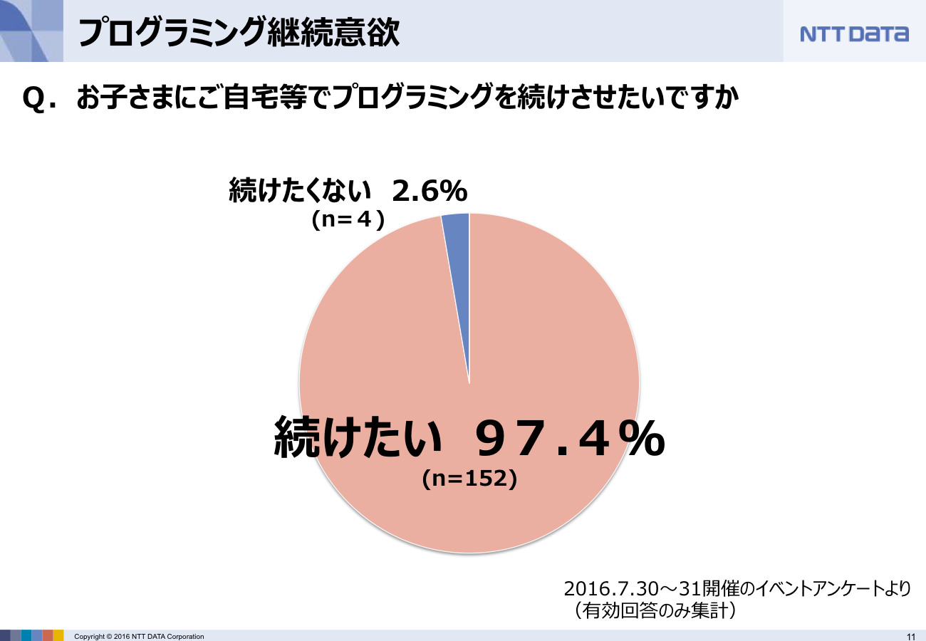 なんと、イベントアンケートでは、97.4%の保護者が、自宅等でプログラミングを続けたいと回答されています。