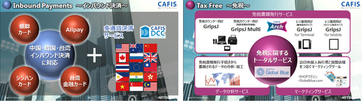 NTTデータの「CAFIS」では、「Inbound Payments」、「Tax Free」、「Promotion」という3つの柱でインバウンドソリューションを展開していきます。