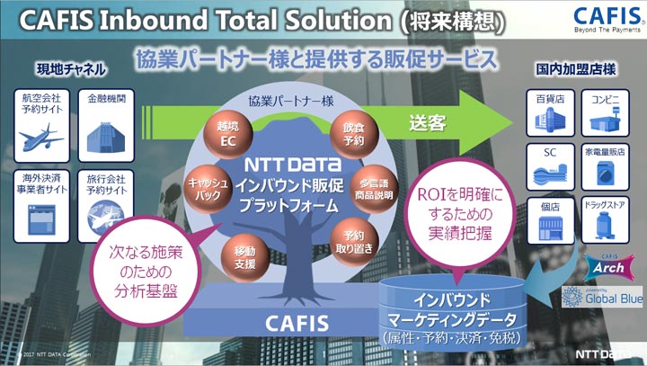 将来的には、「CAFIS」が保有する決済と免税の「インバウンドマーケティングデータ」を活用する「インバウンド販促プラットフォーム」を構築し、インバウンドビジネスに関わる協業パートナー様との連携により、現地チャネルと国内加盟店様の間の決済・免税・送客をシームレスにつなぐ「CAFISインバウンドトータルソリューション」をご提供していきます。
