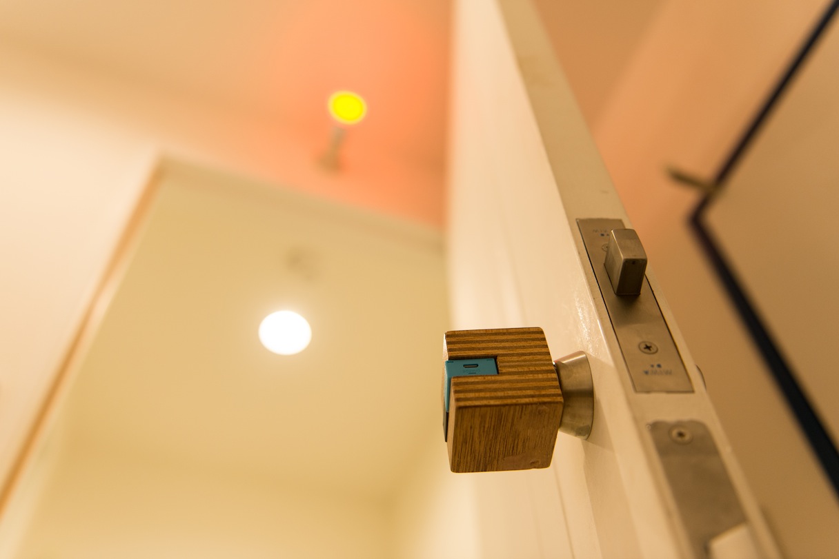 シャワールームの扉の鍵に付けられているのは、ブロック形状をした電子タグのソニー「MESH」。近くに置いたボックスとBluetoothで通信する