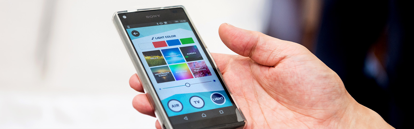 複数の機器を手元のスマホアプリで一括操作できる室内。温度や湿度などの環境情報も収集している