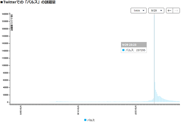 イマツイでは2016年1月15日に初めて『天空の城ラピュタ』放送時間中にツイートされた「バルス」の総量を計測。過去最多のツイート量だった2013年8月のバルス祭りには及ばなかったものの、2時間半の放送時間中に180万ツイートを確認し、バルス祭りが世界規模で広がりを見せている様子もうかがえました。(※2)