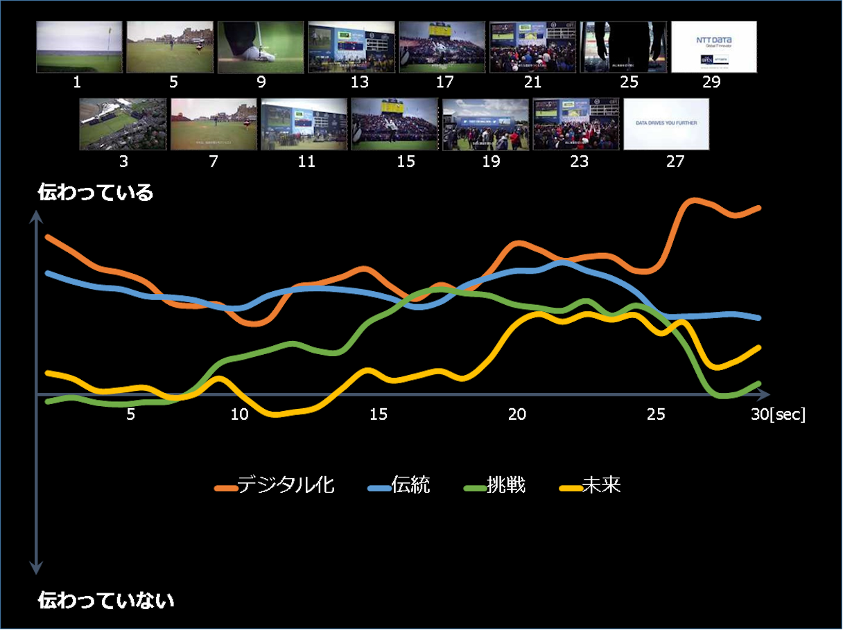 動画視聴中の脳活動を解析し、指標として設定したキーワード「デジタル化」「伝統」「挑戦」「未来」が広告の制作意図どおりに伝わっているかどうかをグラフ化して表示したもの
