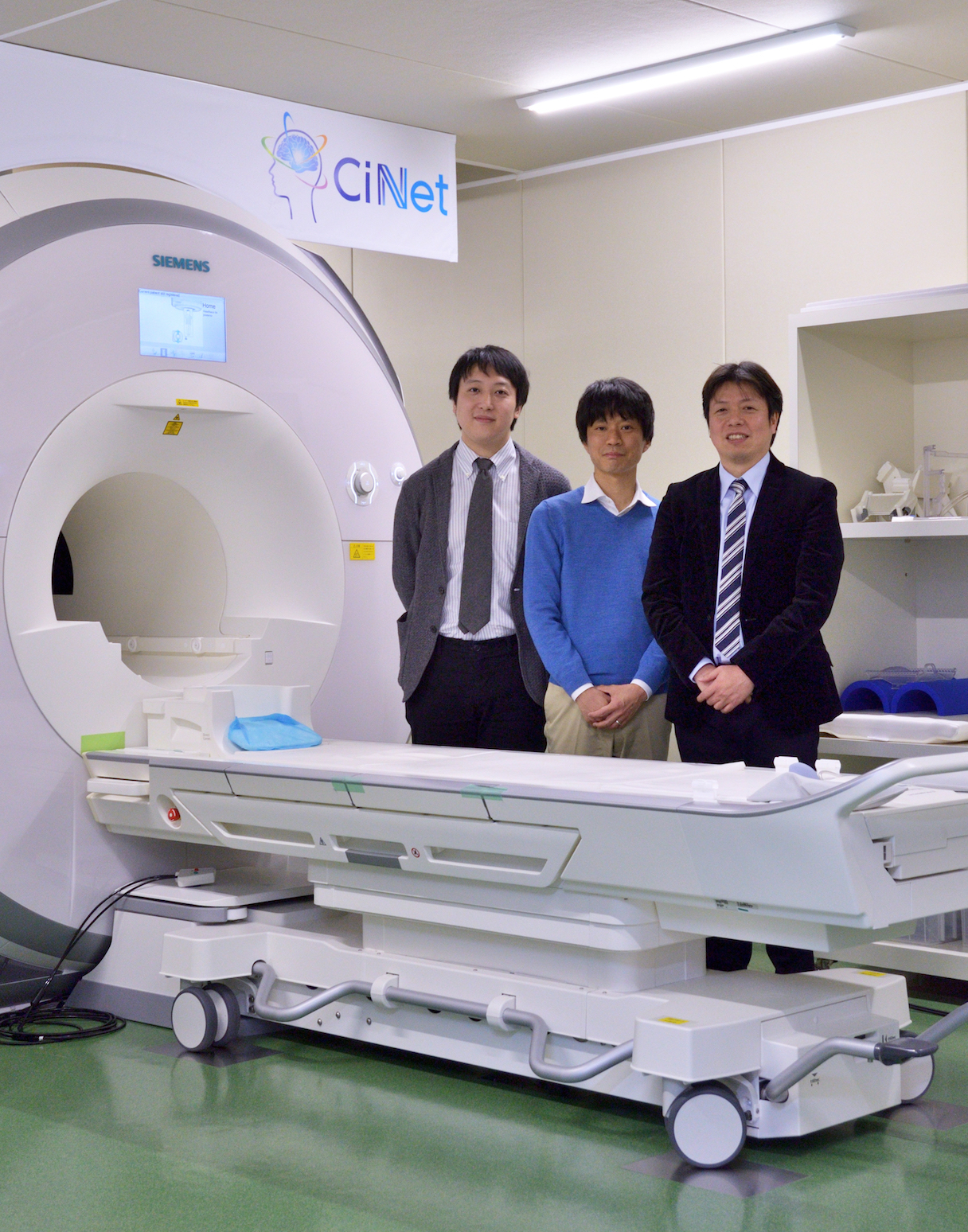 CiNetのfMRIと、「NeuroAI? D-Planner」の開発チーム。左から、茨木拓也(NTTデータ経営研究所)、西本伸志博士、矢野亮(NTTデータ)