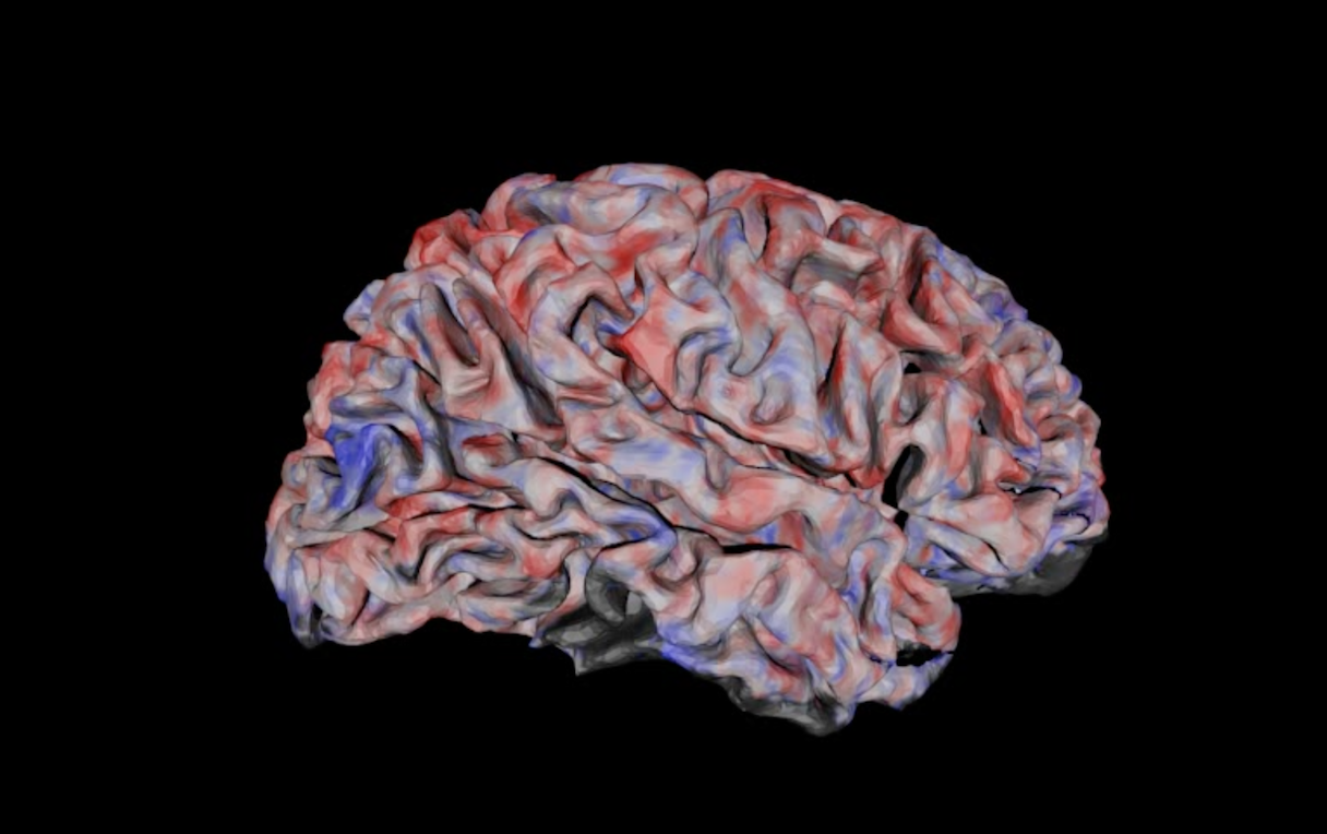 fMRIでイメージングした動画視聴中の脳活動の様子。活性化部位を赤、非活性化部位を青で表示している