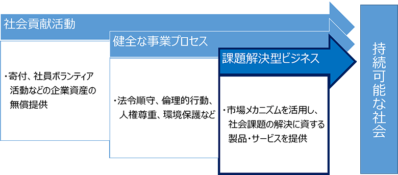 持続可能な社会の実現に向けて、企業はどのようなアプローチで貢献できるでしょうか。金銭寄付や物品寄贈、また、社員のボランティア活動などの「フィランソロピー」を思い浮かべる方が多いかもしれません。また、その企業が、製品やサービスを生産・販売する過程で、大気・海洋汚染などの環境破壊や児童労働などの人権侵害など、環境や社会に対する負荷(外部不経済)をかけている場合は、その生産・販売プロセスを自社の負担で変更すること(内部化)で、持続可能な社会の実現に貢献するという「外部不経済の内部化」というアプローチもあります。これらは引き続き、大変重要な社会との関わり方ではありますが、SDGsの登場で、ある”古くて新しい”アプローチが脚光を浴びています。それが、ビジネスというアプローチです。市場メカニズムを活用して、特に、社会課題の解決に資する製品やサービスをより多くの人々に提供する「課題解決型ビジネス」がSDGsによって推奨されました。但し、注意しなければならないことがあります。それは、その製品やサービスが社会課題の解決に規模感のある正のインパクト、言い換えれば、「社会価値」を創造しているかという点です。この視点を欠いたままビジネスを続けている場合、その企業は、SDGsを単に収益拡大やレピュテーション向上を通じた「企業価値」の創造に利用する「SDGsウォッシュ(見せかけ)」企業として非難されてしまうでしょう。SDGsは企業経営に「フィランソロピー」「外部不経済の内部化」に加えて、「課題解決型ビジネス」を実践するよう求めています。
