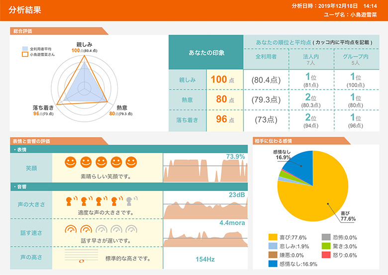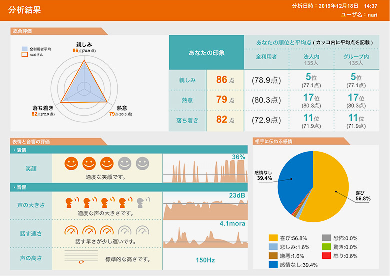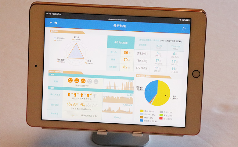 そのサービスは、表情と話し方の特徴をとらえ、相手に伝わる感情などを可視化し気づきを与えるもの。自分の話し方から得られる分析結果をもとに、改善へと導くようサポートしてくれる「Com Analyzer™」(コム・アナライザー)だ。