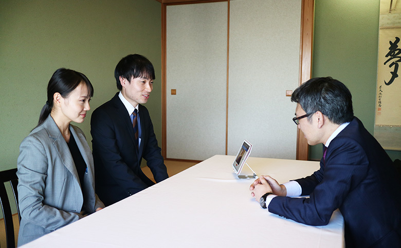 今回の検証では、実際に近い緊張感を再現するため、父親役にはA君の上司を配役。さらに、特別に厳かな雰囲気の和室を用意してみた。さっそくシミュレーション開始。A君が婚約者役の成田さんと並んで座り、父親役の上司に挨拶を始める。普段のA君を知る筆者には少し緊張した面持ちであることが分かったが、知らない人から見れば絶やさぬ笑顔が親しみやすさを醸し出し、緊張している様子はほとんど伝わらない。その様子を淡々と撮影、分析するCom Analyzer。一通りの自己紹介と"彼女への想い"を熱く語って測定は終了。ミスなくこなしたA君は若干得意げでもある。果たして結果はどう出るか。
