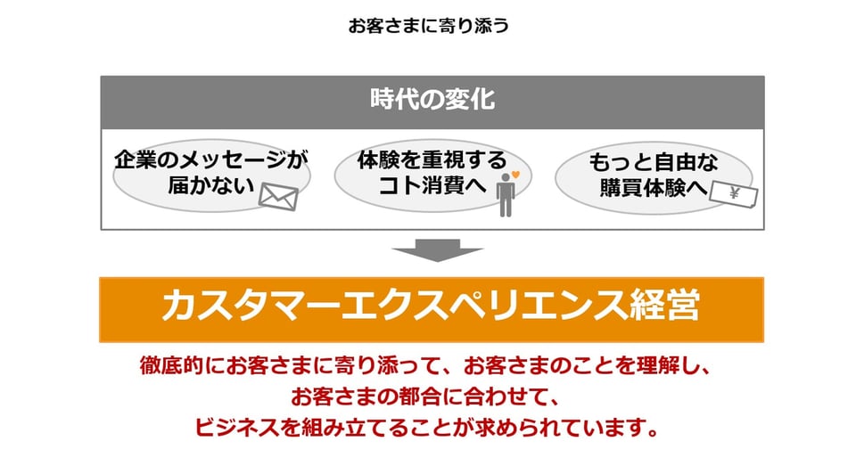 「企業は、このような時代の変化を捉え、今のお客さまに徹底的に寄り添い、お客さまのことを深く理解し、お客さまの都合に合わせてビジネスを組み立てる『カスタマーエクスペリエンス経営』が求められています」と佐々木氏は説きます。