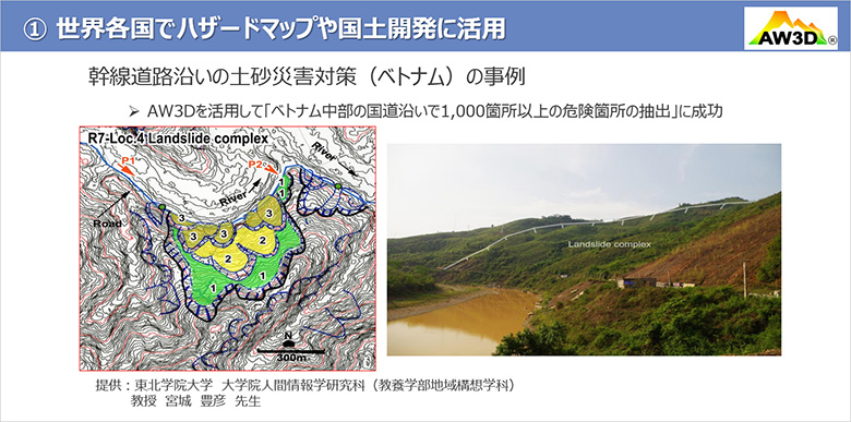 「幹線道路沿いの土砂災害対策(ベトナム)の事例」では、以前は1カ所ずつ現地に赴いていたところを、AW3Dの活用で、ベトナム中部の国道沿いで千カ所以上の危険箇所の抽出に成功しました。つまり、できなかったことがデジタルによって突然できるようになったわけです。時間短縮、コスト低減はもちろんです。