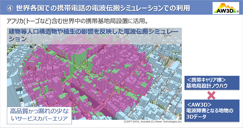 もう一つは、多様な技術が連携することによって新しい価値を生んだ例です。「世界各国での携帯電話の電波伝搬シミュレーションでの利用」では、パートナーとなる他社の電波のシミュレーション技術と、私たちの地図データを持ち寄ってスタートしたプロジェクトです。