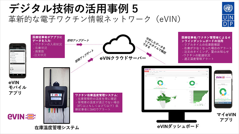 近藤私からは「革新的な電子ワクチン情報ネットワーク(eVIN)」を紹介します。インドは非常に暑く、広大な国土を持ちます。しかし、ワクチンは温度の変化に非常に弱く、常に2℃~8℃に保つ必要があり、その温度範囲を超えると、そのワクチンは使えないどころか、摂取すれば健康被害が起きます。
