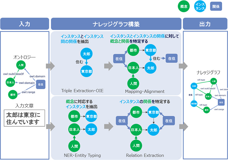 (1)の手法は、入力文章から、「太郎が東京都に住む」という関係を抽出し、「東京都が都市」であり、「太郎は日本人」、「住むのが在住」という概念であることを紐づけます。