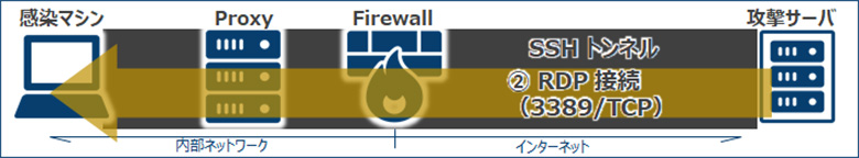 (2)作成された SSH トンネルを利用し攻撃サーバから感染マシンへ SSH とは逆方向に RDP 接続します。既に作成されたトンネルの中を利用するため、インターネットから内部ネットワークへの通信であるにも関わらず、この RDP 接続は成功します。