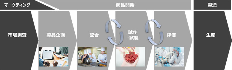 商品開発のプロセスは、大きく分けて「(1)商品企画」、「(2)配合(レシピ検討)」、「(3)試作・試製」、「(4)評価」の4プロセスで構成されています。