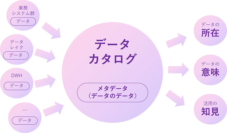 このようなお客様からのご相談が増えており、「データカタログ」での解決をご案内しています。データカタログとは「データのデータ」である「メタデータ」を管理し、「欲しいデータはどこにあるか」「目の前のデータはどういう意味か」「それを活用するにはどうしたらよいか」を提示するツールです。