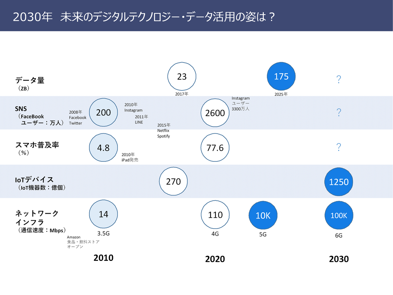 例えば、今から10年前は、スマホ普及率がたった4.8%でした。一方で今から10年後の2030年では、通信速度が5Gの約1,000倍とも言われる6Gが普及して、リアルとバーチャルが本当に一体になっていく世界が実現すると見込まれています。IoTデバイスや、そこから取得されるデータ量もどんどん増えていくでしょう。