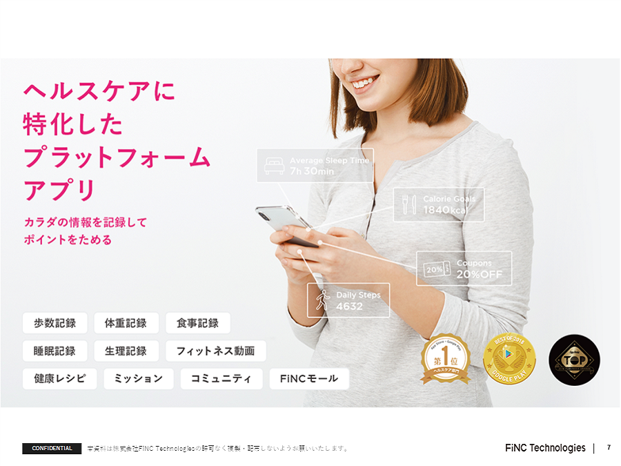 島田さん:弊社(株式会社FiNC Technologies)では「FiNC」というヘルスケアアプリを軸に事業展開をしており、最近ユーザー数が1,000万を超えました。1,000万を超えると当然ながら年齢も性別も広がるので、今後はより多くの方にご利用いただけるようなUI/UXに変えていく方針です。