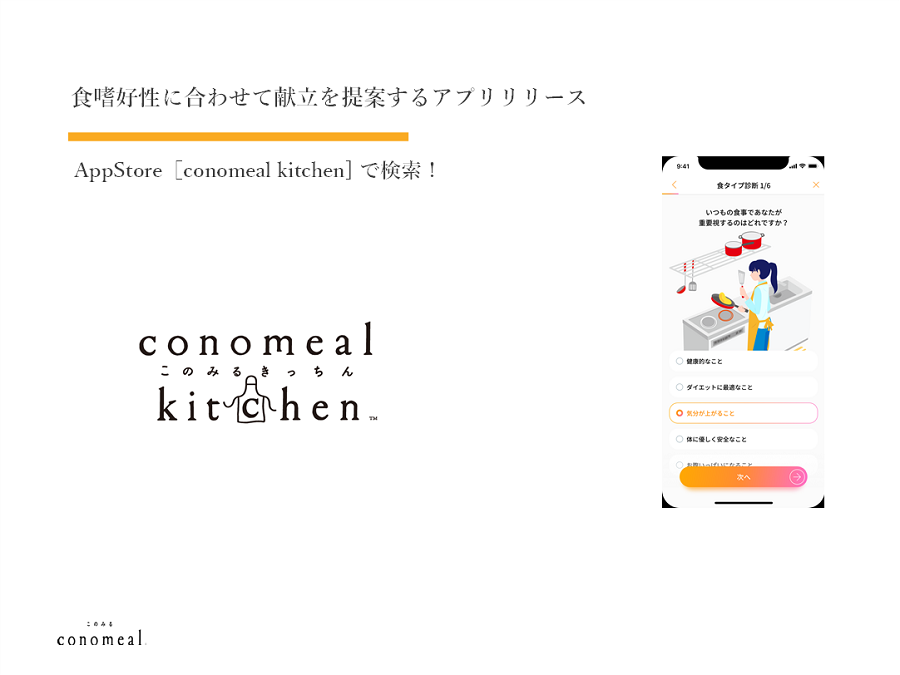 そこで、過去30年間解決されていない献立作りの悩みに着目しています。家庭で料理をする人の食嗜好を、①食に対する価値観、②気持ち、③誰に料理を作るかの3つの基準で分析し、お客さまに合った献立を提案する「conomeal kitchen(このみるきっちん)」アプリを開発しました。
