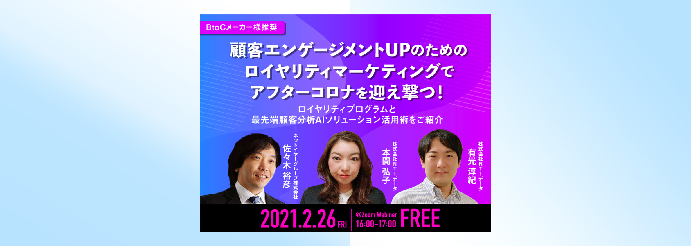 併せて、NTTデータのこれまでのノウハウを活かした、ロイヤリティプログラムを一気通貫でご支援するロイヤリティマネジメントサービスもご紹介予定です。