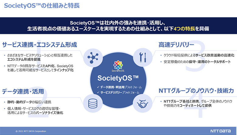 「SocietyOS™」は、NTTデータ/NTTグループのサービスはもちろん、さまざまな価値あるソリューション、IoTセンサー、各種データとも連携し、「つながる力」で新たな高付加価値サービスを生み出すサービスデリバリープラットフォームであり、生活者視点のサービスを迅速に提供する。大きな特長としては、以下の4つが挙げられる。