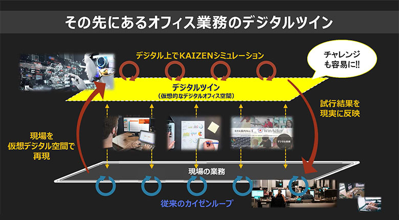 デジタル空間にオフィスを再現できれば、そこでさまざまなKAIZEN策をシミュレートし、良い結果が出たものだけを現実の業務に落とし込むことが可能となる。イノベーションにつながるチャレンジをリスクなく、積極的に行えるようになるというわけだ。デジタルツインで試行して、上手くいったものを現場で採り入れる、このループを回すのが最終ゴールだと中川は語り、次のように呼びかけて、セッションを締めくくった。