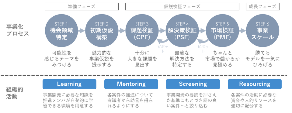 時間をかけて精緻な事業プランをつくり、最初から大きく投資する従来型のプロセスではなく、小さなアイデアからプロトタイプを作成し、マーケットに投入していくまでの間に「解決したい課題は存在するか」「解決策は妥当か」「市場に受け入れられるか」といったチェックポイントを設けて段階的に評価を行い、少しずつ投資を積み上げていくようなプロセスを採用しています。
