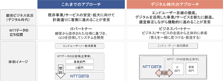 DXの広がりを受けて、NTTデータとお客様との関係にも変化が出てきました。DXでは、お客様もエンドユーザーも、求めるものが不明瞭であることが多くなってきました。NTTデータとお客様が共にユーザーを理解し、体験を設計し、仮説検証しながら推進するアプローチが求められています(図1)。「DXを通してより良いビジネス変革を実現したい」というお客様のご期待に応え続けていく取り組みが必要になるのです。