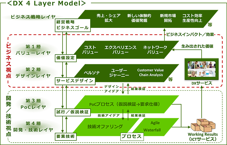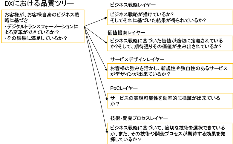ここで、ビジネス戦略レイヤーはお客様の経営戦略や市場の動向に強く依存するため、一様にモデル化することは難しいことから、価値提案以降の4階層をDX品質保証の対象としています。