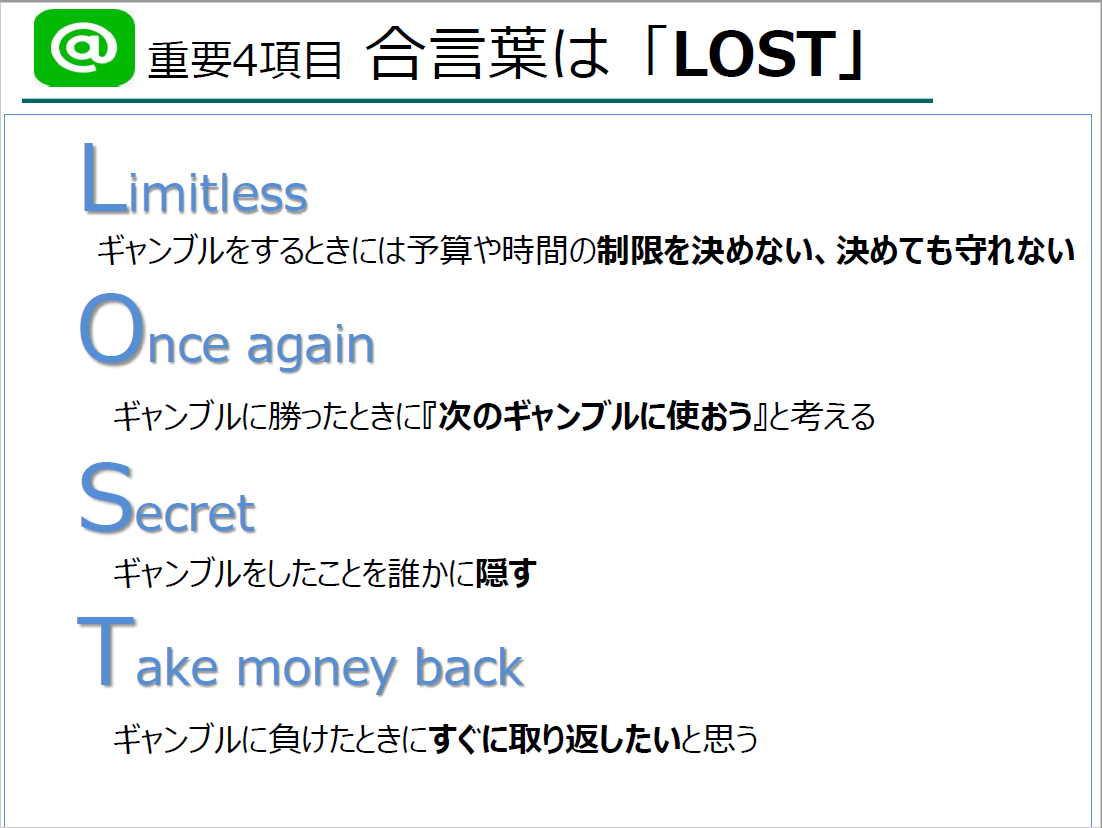 筒井さん:既存の診断方法で使われている項目などを参考にオリジナルの設問項目案を作成し、ギャンブル愛好家とギャンブル依存に悩んでいる方へのアンケート調査を行った結果、4つの質問だけで愛好家と依存症者を高い精度で識別することができるという発見につながりました。1年以内のギャンブル経験で、この設問のうち2つ以上の答えが「はい」になる場合は、依存の疑いが出てきます。ちなみに、設問の頭文字から「LOST」と呼んでいますが、これは田中さんのグループに命名をしていただいたものです。
